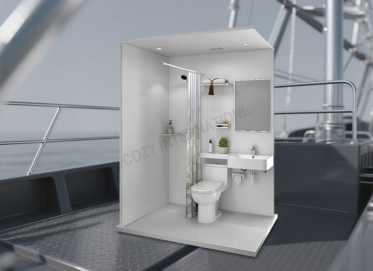 Фабричный санузловый блок представляет собой готовую конструкцию, включающую все элементы: потолок, стены, пол и сантехническое оборудование. Потолок, пол и стены изготовлены из SMC (композита для листового формования). Этот материал обладает высокой прочностью и малым весом, поэтому называется аэродинамическим материалом и обычно используется в багаже самолётов и шкафах. Пол формируется методом прессования при высокой температуре и давлении, он представляет собой цельную единицу с герметичной водоизоляцией. Установка может быть выполнена за 4 часа.